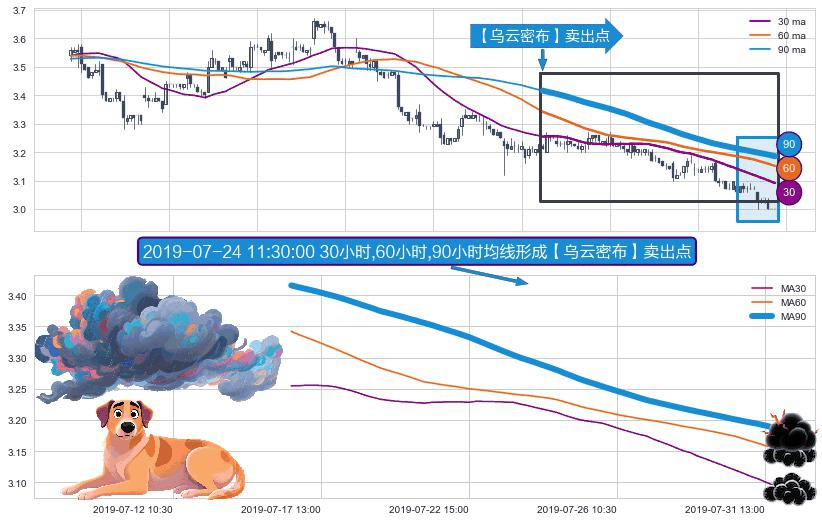 形态多维评估: ⚀ 2019-07-16 15:00:00小时-2019-07-31 15:00:00小时显现 30小时-60小时-90小时均线 【乌云密布】卖出点 看空信号,后市看跌,卖出