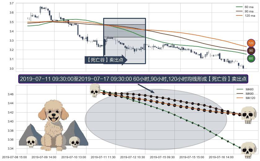 形态多维评估: ⚀ 2019-07-11 10:30:00-小时至2019-07-17 09:30:00-小时显现 60小时-90小时-120小时均线 【死亡谷】卖出点 看空信号,后市看跌,卖出