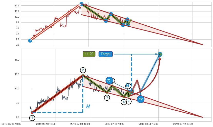 ➣ 【支撑】低点支撑位【③⑤⑦】一底低于一底,构成扩散三角的下斜边