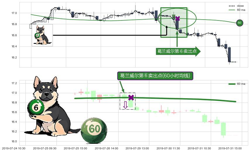 形态多维评估: ⚀ 2019-07-26 15:00:00-小时显现 葛兰威尔均线 60小时均线 第⑥卖出点 走势反转见顶信号,后市看跌,卖出信号