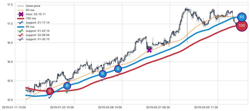 上涨趋势01-11 13:00-03-08 14:00,均线65, 100确认关键支撑4处
