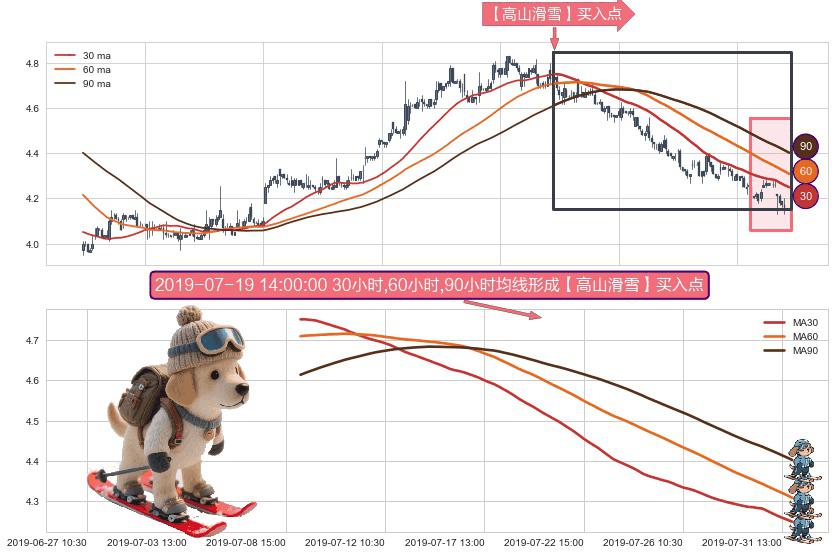 形态多维评估: ⚀ 2019-07-09 11:30:00小时-2019-07-31 15:00:00小时显现 30小时-60小时-90小时均线 【高山滑雪】买入点 看多信号,后市看涨,买入
