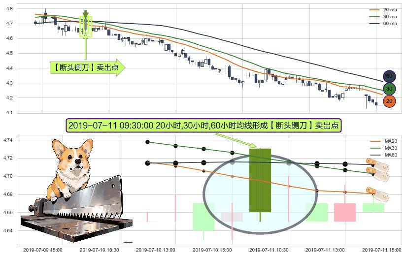 形态多维评估: ⚀ 2019-07-11 09:30:00小时显现 20小时-30小时-60小时均线 【断头铡刀】卖出点 看空信号,后市看跌,卖出