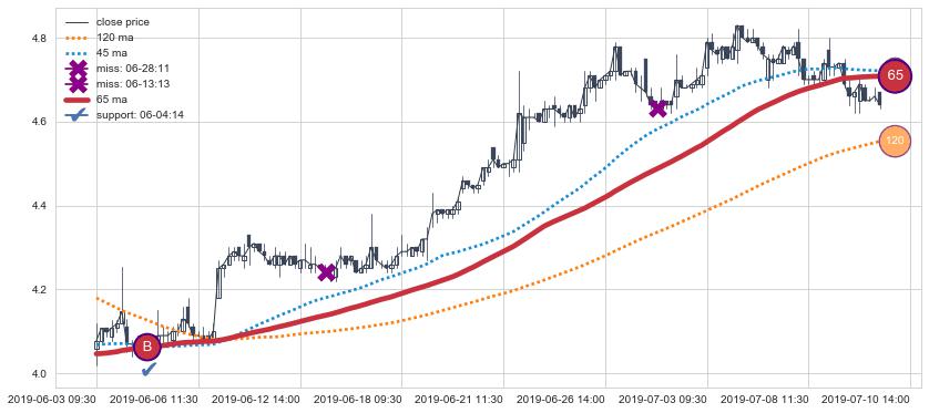 上涨趋势06-03 09:30-07-10 14:00,均线65确认关键支撑1处