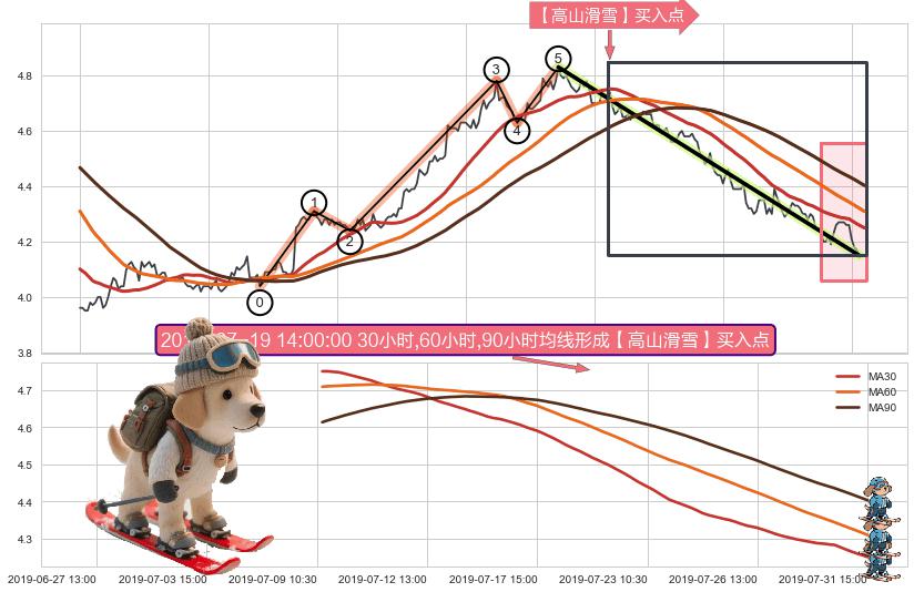 从2019-07-04 09:30至2019-07-31 15:00,共包含120个小时,阶段股价下跌-15.00%,阶段股价变动位移路程比: 1 : 3