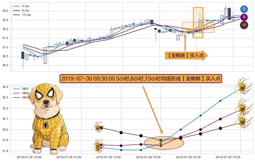 形态多维评估: ⚀ 2019-07-30 09:30:00小时显现 5小时-8小时-13小时均线 【金蜘蛛】买入点 看多信号,后市看涨,买入
