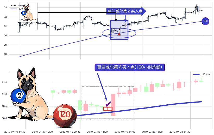 形态多维评估: ⚀ 2019-07-18 15:00:00-小时显现 葛兰威尔均线 120小时均线 第②买入点 上升趋势的中继信号,后市看涨,买进信号