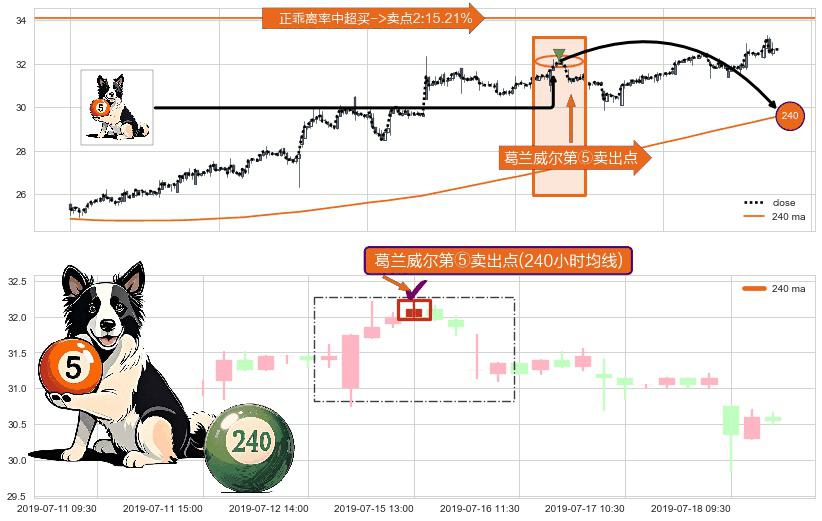 形态多维评估: ⚀ 2019-07-15 13:00:00-小时显现 葛兰威尔均线 240小时均线 第⑤卖出点 上升趋势均值回复的短线回落信号,后市看跌,卖出信号