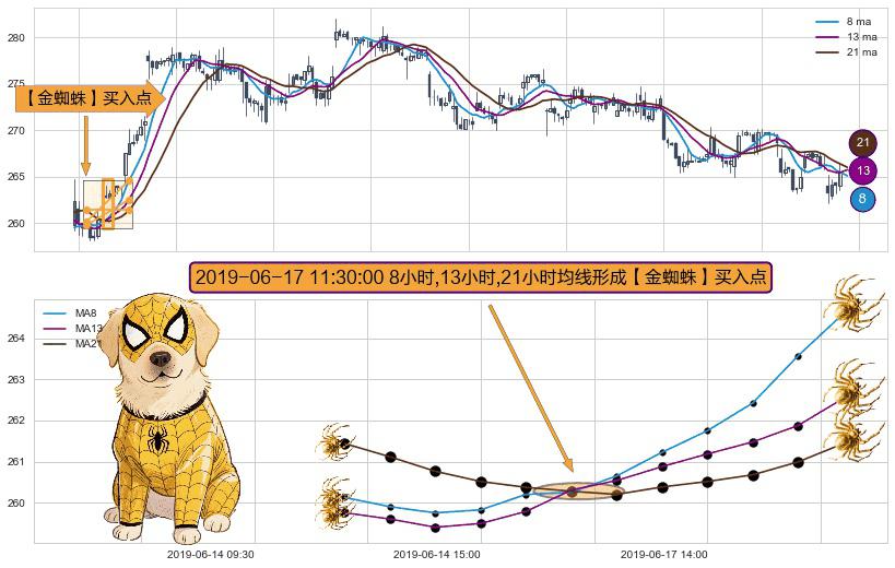 形态多维评估: ⚀ 2019-06-17 11:30:00小时显现 8小时-13小时-21小时均线 【金蜘蛛】买入点 看多信号,后市看涨,买入