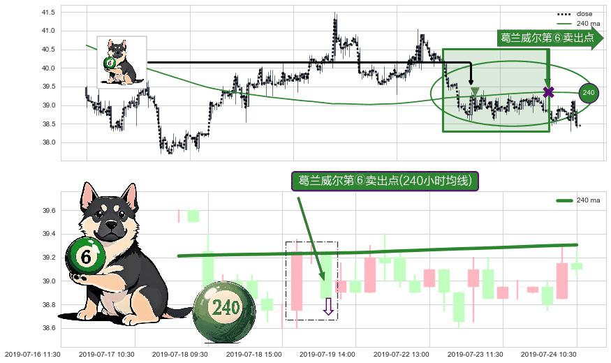形态多维评估: ⚀ 2019-07-19 11:30:00-小时显现 葛兰威尔均线 240小时均线 第⑥卖出点 走势反转见顶信号,后市看跌,卖出信号