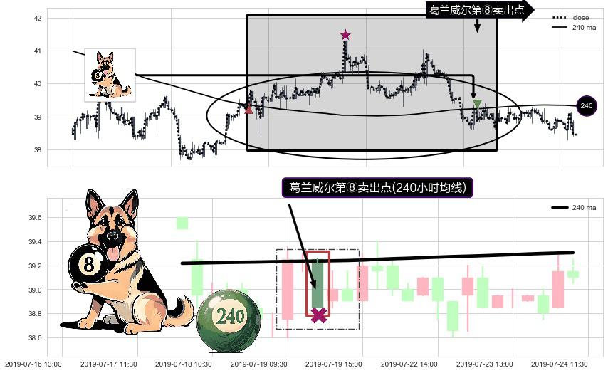 形态多维评估: ⚀ 2019-07-19 11:30:00-小时显现 葛兰威尔均线 240小时均线 第⑧卖出点 下降趋势的中继信号,后市看跌,卖出信号
