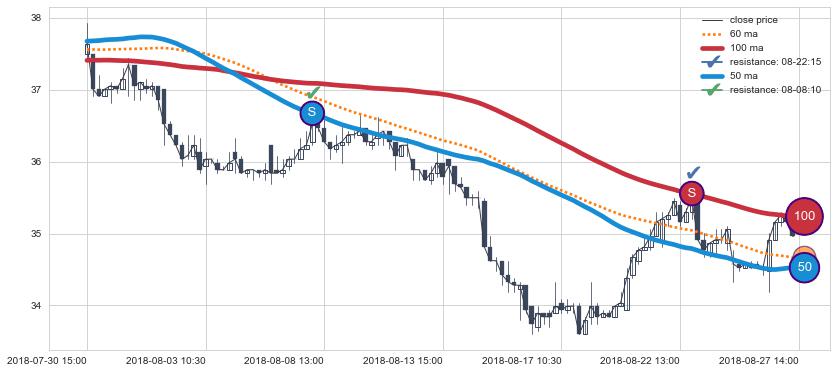 下跌趋势07-30 15:00-08-27 14:00,均线50, 100确认关键阻力2处