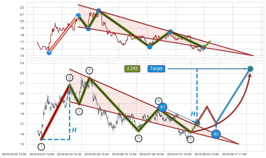 ➢ 最小中继整理涨幅→𝐇: 0.5350 (𝐇楔型旗杆的长度:楔型起点→顶点)