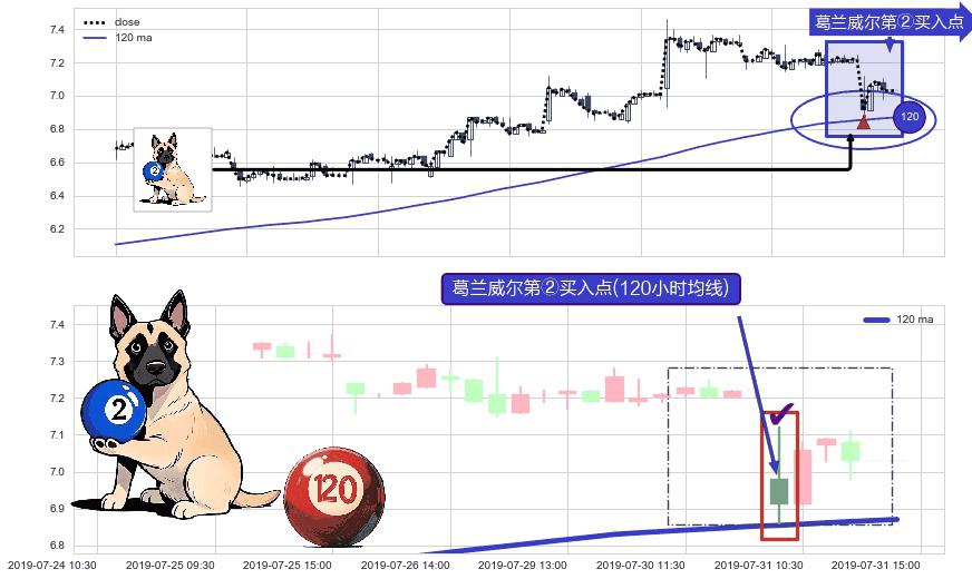 形态多维评估: ⚀ 2019-07-31 09:30:00-小时显现 葛兰威尔均线 120小时均线 第②买入点 上升趋势的中继信号,后市看涨,买进信号