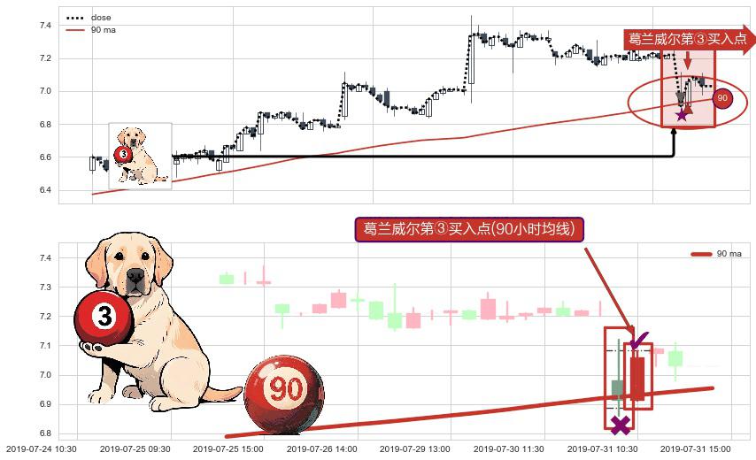 形态多维评估: ⚀ 2019-07-31 10:30:00-小时显现 葛兰威尔均线 90小时均线 第③买入点 上升趋势的中继信号,后市看涨,买进信号