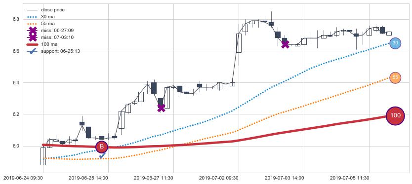 上涨趋势07-11 14:00-07-30 10:30,均线30, 55确认关键支撑3处
