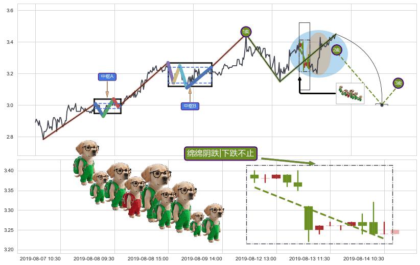 从2019-07-11 09:30至2019-08-15 15:00,共包含156个小时,阶段股价下跌-0.28%,阶段股价变动位移路程比: 1 : 305