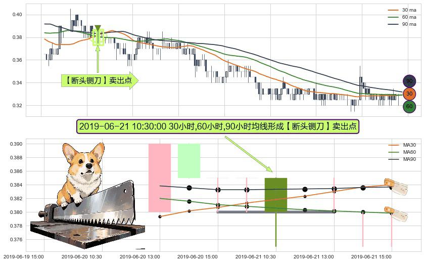 形态多维评估: ⚀ 2019-06-21 10:30:00小时显现 30小时-60小时-90小时均线 【断头铡刀】卖出点 看空信号,后市看跌,卖出