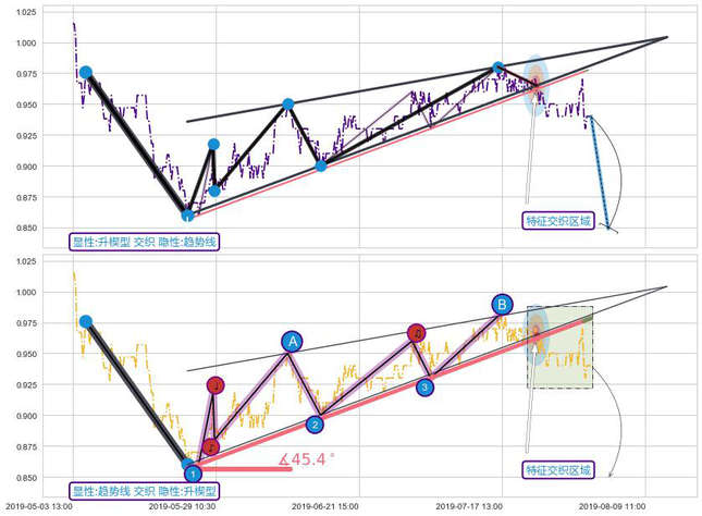 ➢ 2019-05-23 15:00-2019-07-31 09:30上升趋势存在反转[风险],其原上升趋势的支撑位(0.9784)已破位[强阻力信号],原上升趋势角度: 45.4˚