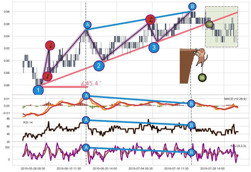 ➢ 最后的上涨趋势2019-05-23 15:00至2019-07-31 09:30:存在破位迹象,后续小调整或者反转下跌