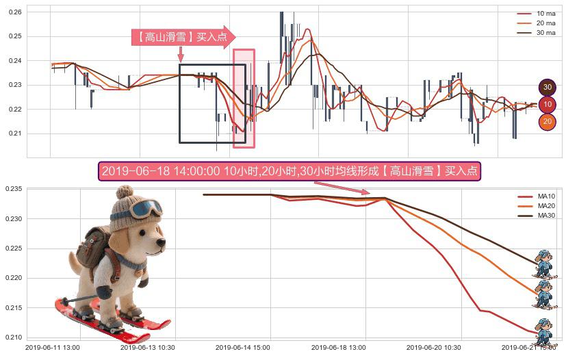 形态多维评估: ⚀ 2019-06-13 14:00:00小时-2019-06-21 13:00:00小时显现 10小时-20小时-30小时均线 【高山滑雪】买入点 看多信号,后市看涨,买入