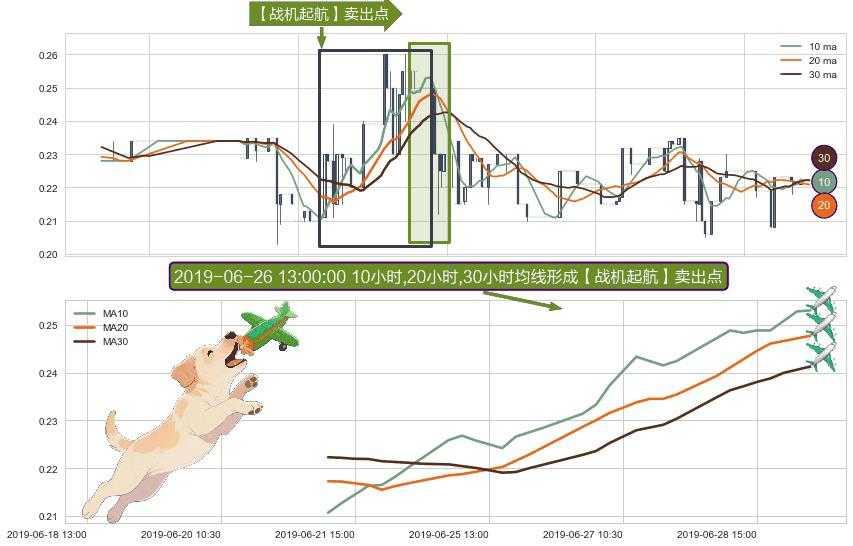 形态多维评估: ⚀ 2019-06-21 13:00:00小时-2019-07-02 13:00:00小时显现 10小时-20小时-30小时均线 【战机起航】卖出点 看空信号,后市看跌,卖出