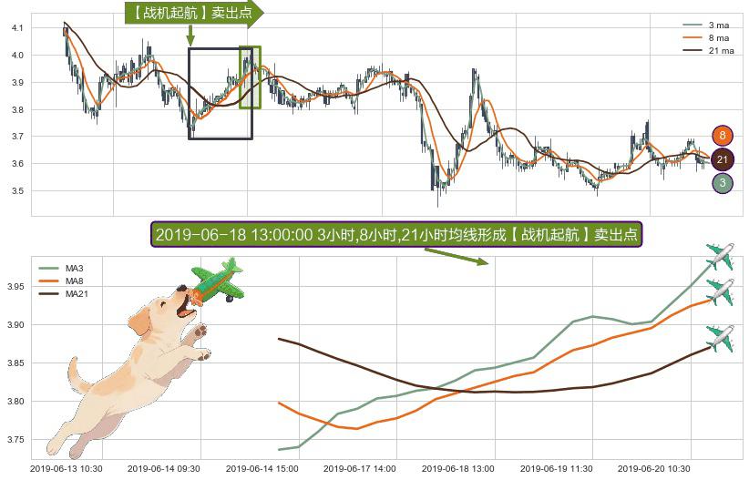 ⚀ 2019-06-14 14:00:00小时-2019-06-20 11:30:00小时显现 3小时-8小时-21小时均线 【战机起航】卖出点 看空信号,后市看跌,卖出
