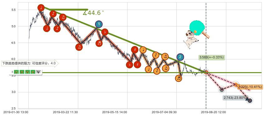 ♘ 在最后的下跌阶段2019-02-14 15:00至2019-07-11 09:30,存在 破位边缘的阻力位 ,阻力价格3.588,可信任强度83.08%,其距离最后价格3.600相差 -0.33%