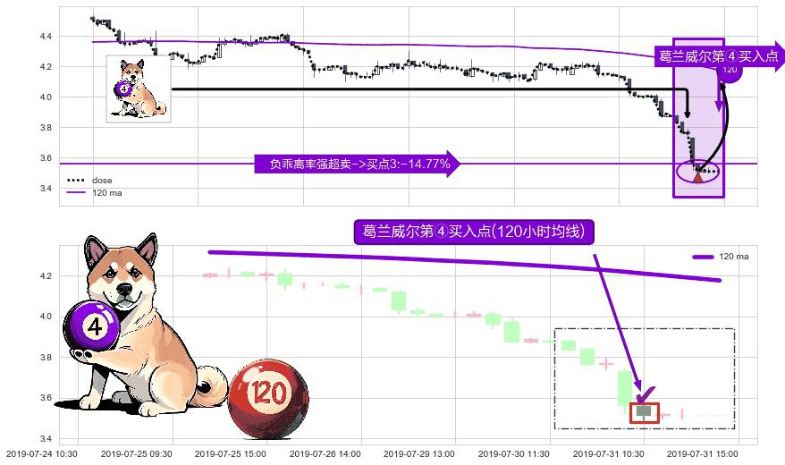 形态多维评估: ⚀ 2019-07-31 10:30:00-小时显现 葛兰威尔均线 120小时均线 第④买入点 下降趋势均值回复的短线反弹信号,后市看涨,买进信号