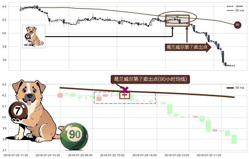 形态多维评估: ⚀ 2019-07-25 15:00:00-小时显现 葛兰威尔均线 90小时均线 第⑦卖出点 下降趋势的中继信号,后市看跌,卖出信号