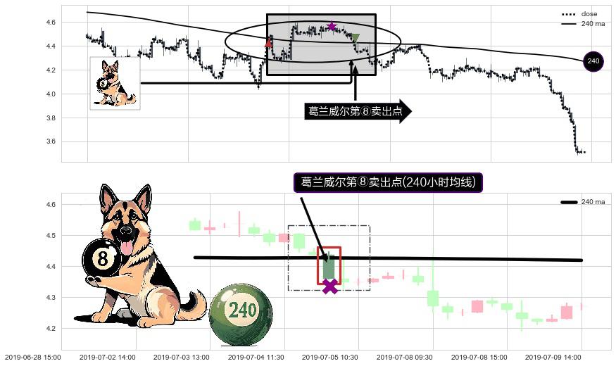 形态多维评估: ⚀ 2019-07-04 15:00:00-小时显现 葛兰威尔均线 240小时均线 第⑧卖出点 下降趋势的中继信号,后市看跌,卖出信号