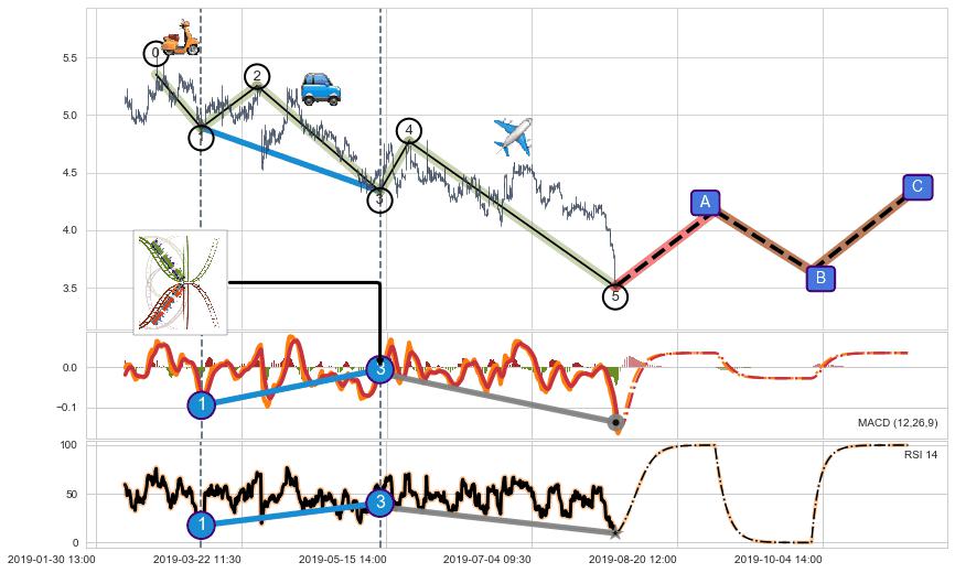 | 4 🅚:【高山滑雪】买入点 ➕ 🌊:波浪理论猜想下跌浪5已形成,猜想后续形成abc反弹上涨(均值回复) ☞ 看多信号 ⇥ 【均线】交织【图形】⇥ 综合量化分数: 52 | > |
