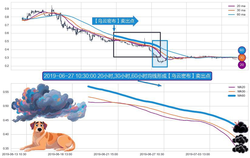 ⚀ 2019-06-19 14:00:00小时-2019-07-05 13:00:00小时显现 20小时-30小时-60小时均线 【乌云密布】卖出点 看空信号,后市看跌,卖出