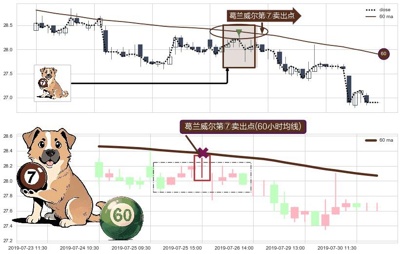 形态多维评估: ⚀ 2019-07-25 15:00:00-小时显现 葛兰威尔均线 60小时均线 第⑦卖出点 下降趋势的中继信号,后市看跌,卖出信号