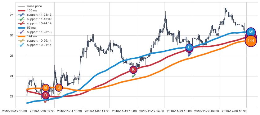 上涨趋势10-19 15:00-12-06 10:30,均线65, 105, 144确认关键支撑4处