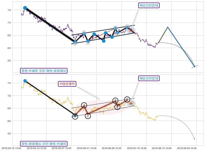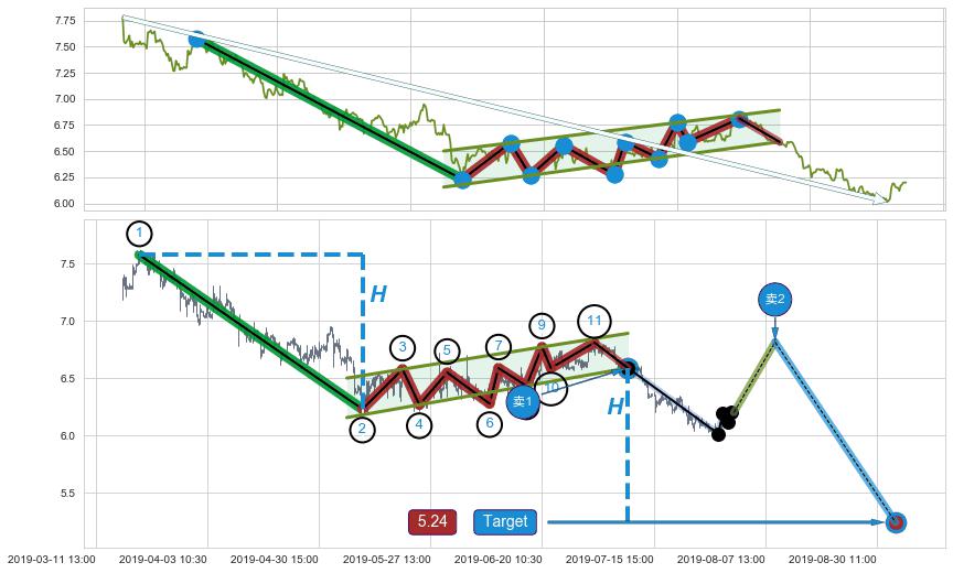 从2019-06-10 11:30至2019-06-20 10:30,共包含48个小时,阶段股价上涨7.74%,阶段股价变动位移路程比: 1 : 2