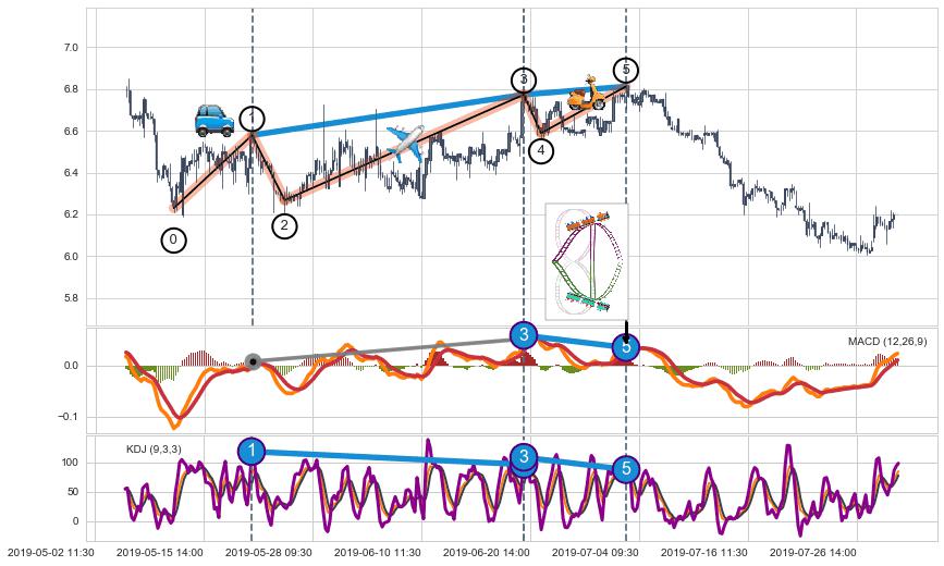 ➣ 第一, 三驱动浪端点:【KDJ】走势出现【常规背离 & 反转信号】背离程度26.51%,背离夹角角度38.0˚,背离程度较小