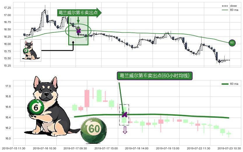 ⚀ 2019-07-18 09:30:00-小时显现 葛兰威尔均线 60小时均线 第⑥卖出点 走势反转见顶信号,后市看跌,卖出信号