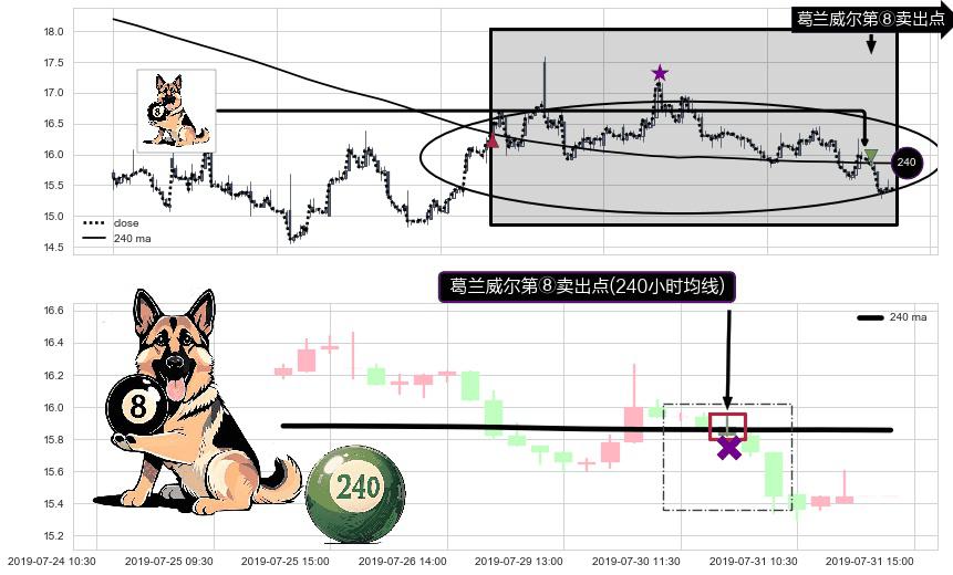 ⚀ 2019-07-30 14:00:00-小时显现 葛兰威尔均线 240小时均线 第⑧卖出点 下降趋势的中继信号,后市看跌,卖出信号