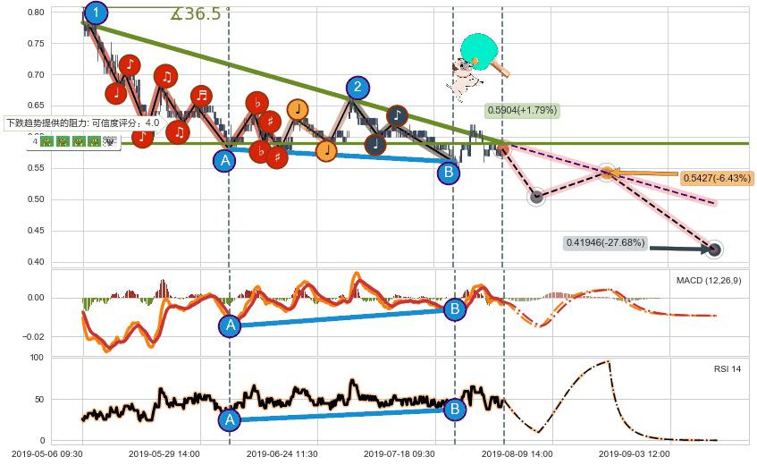 ➣ 预测:2019-08-21 14:00,【试探阻力】稳定目前下跌趋势的前提下,预测价格:0.5427