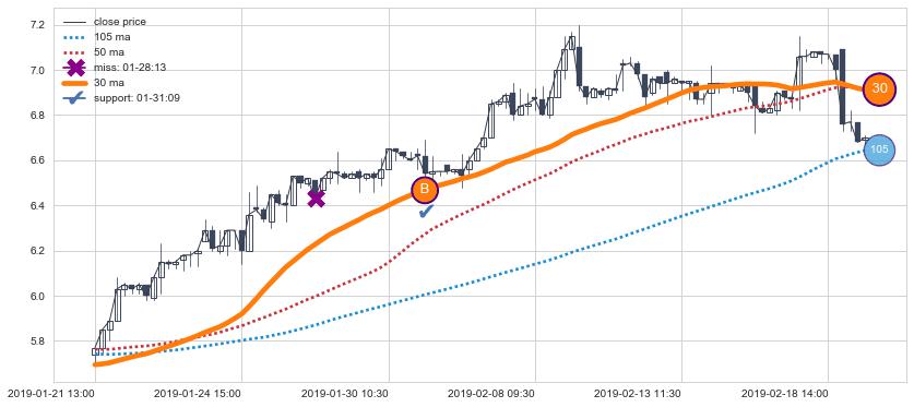 下跌趋势07-08 11:30-07-31 15:00,均线105, 50确认关键阻力4处