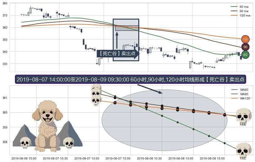 形态多维评估: ⚀ 2019-08-07 15:00:00-小时至2019-08-09 09:30:00-小时显现 60小时-90小时-120小时均线 【死亡谷】卖出点 看空信号,后市看跌,卖出