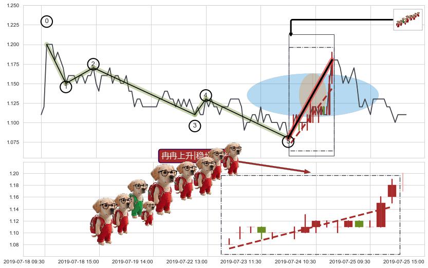 从2019-07-18 09:30至2019-07-31 15:00,共包含60个小时,阶段股价上涨2.17%,阶段股价变动位移路程比: 1 : 20