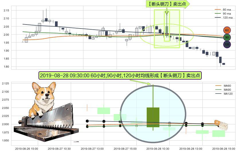 形态多维评估: ⚀ 2019-08-28 09:30:00小时显现 60小时-90小时-120小时均线 【断头铡刀】卖出点 看空信号,后市看跌,卖出