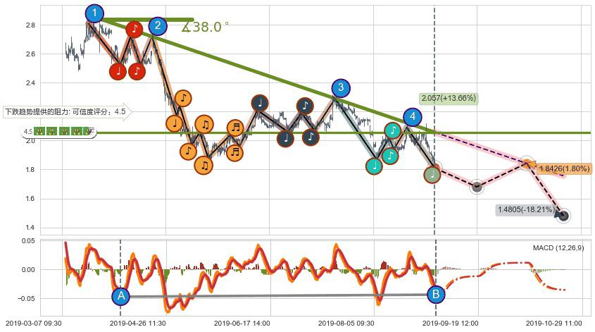 从2019-03-19 14:00至2019-08-30 15:00,共包含668个小时,阶段股价下跌-40.14%,阶段股价变动位移路程比: 1 : 11,下跌趋势角度: 38.0