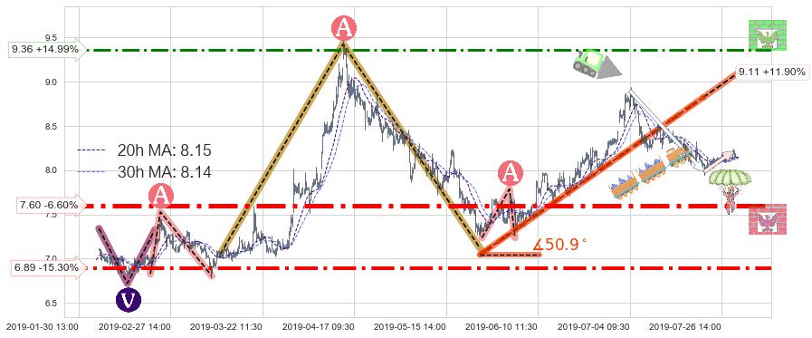 ♘ 支撑价格位7.60,可信任强度93.52%,距离最后交易2019-07-31 15:00形成的收盘价格8.14相差 -6.60%