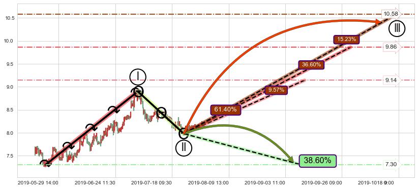 从2019-06-03 10:30至2019-06-13 15:00,共包含47个小时,阶段股价上涨7.31%,阶段股价变动位移路程比: 1 : 3