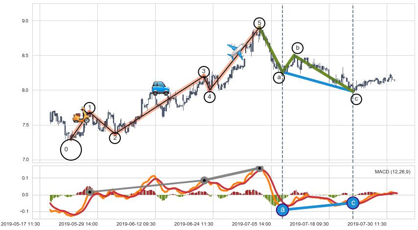 从2019-07-09 11:30至2019-07-23 13:00,共包含62个小时,阶段股价下跌-3.34%,阶段股价变动位移路程比: 1 : 7