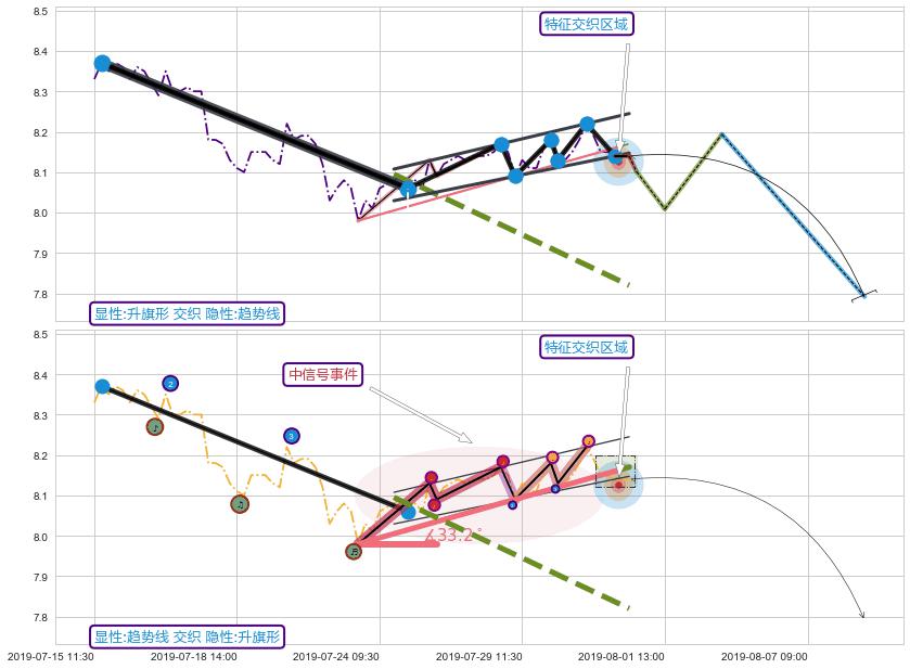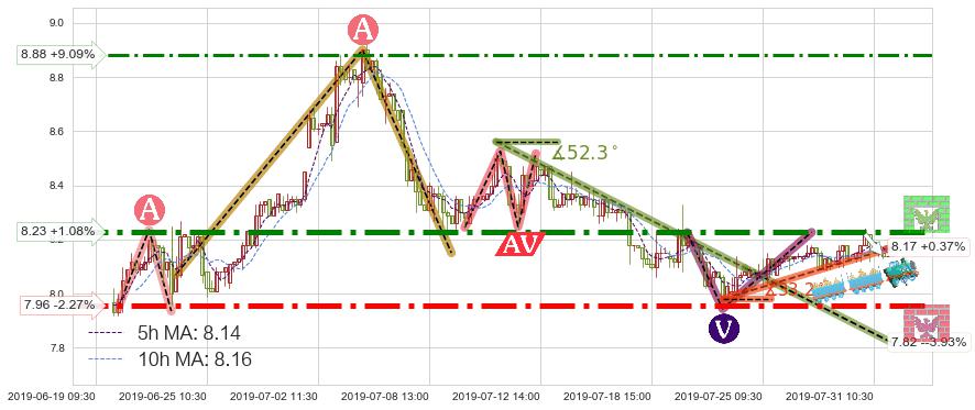 ✂️ 2019-07-23 13:00-2019-07-31 14:00上升趋势存在反转[风险],虽然原上升趋势的支撑位(8.17)已破位,但其支撑效果尚存,原上升趋势角度: 33.2˚