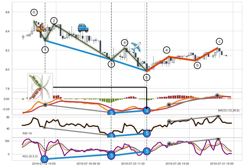 ➢ 1,3,5驱动浪MACD, RSI, KDJ走势都出现【常规背离】反转信号增强